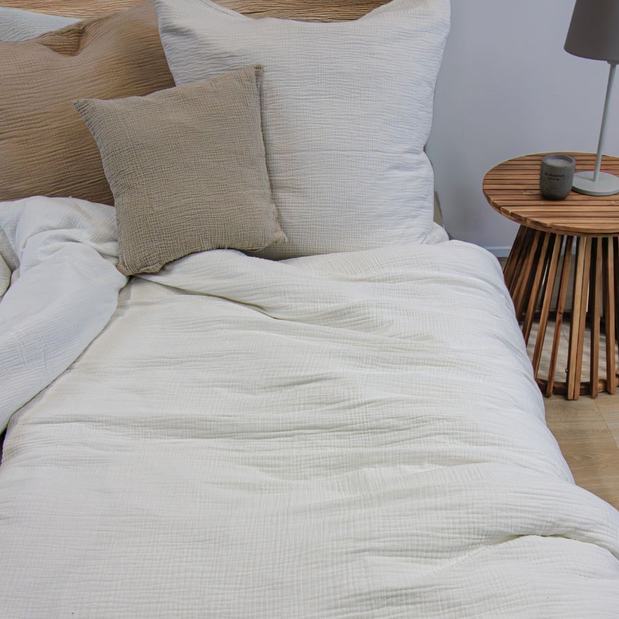 Bettwäsche in weichem und fliessendem Musselin aus 100% Baumwolle. Locker gewebter Stoff mit Crinkle-Struktur. Bettwäsche aus der Frühling/Sommer Kollektion 2025 von FLEURESSE.