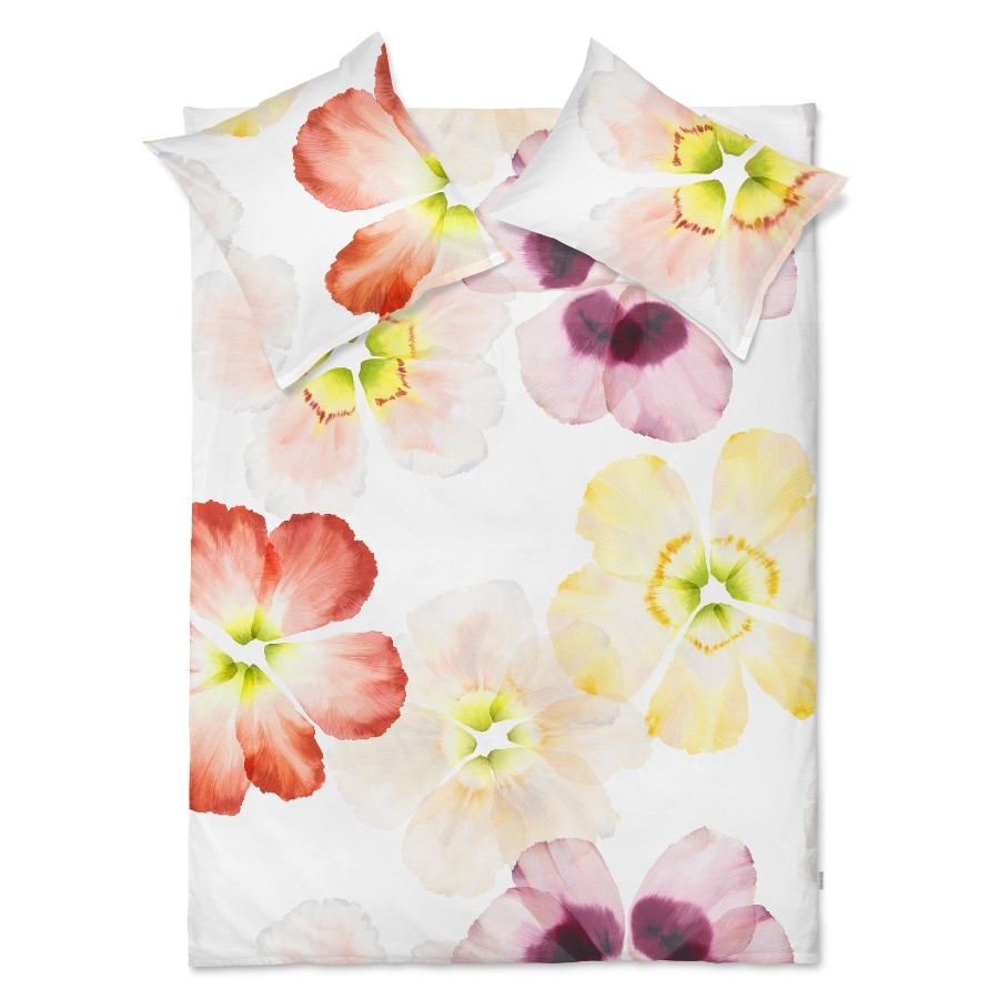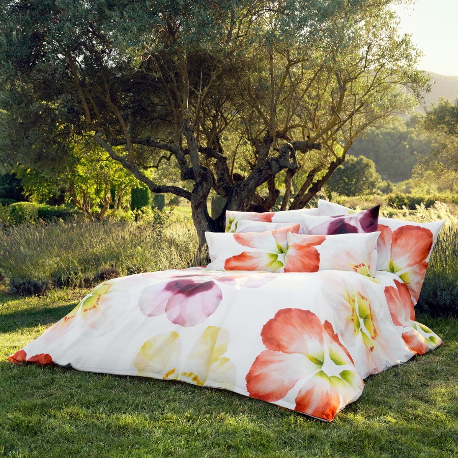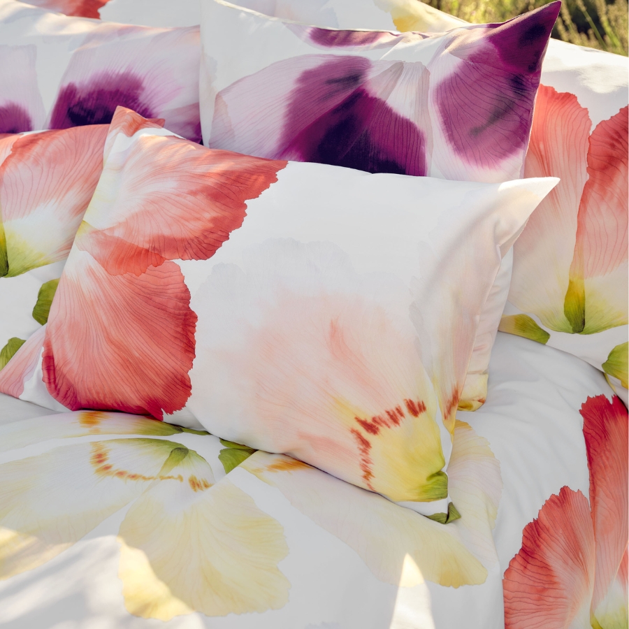 Bettwäsche aus der Frühling/Sommer Kollektion 2025 von SCHLOSSBERG. Wie eine Ode an den Frühling, an sein sanftes Erwachen und seine unbändige Lebensfreude, so strecken sich die bunten Tulpenblütenköpfe auf AURORA der Sonne entgegen. Dank dem Blick durch ein Vergrösserungsglas und einer aussergewöhnlichen Maltechnik aus reinweissem Papier, Nadel und Aquarellfarben lässt sich jede Finesse dieser Blütenblätter aus nächster Nähe bewundern. Naturgetreu eingefangen mit Sonnengelb, kräftigem Rot, tiefem Violett, pudrigem Apricot und Rosé entsteht eine einzigartig lebendige Dynamik wie wir sie nur von diesen Frühlingsboten kennen.