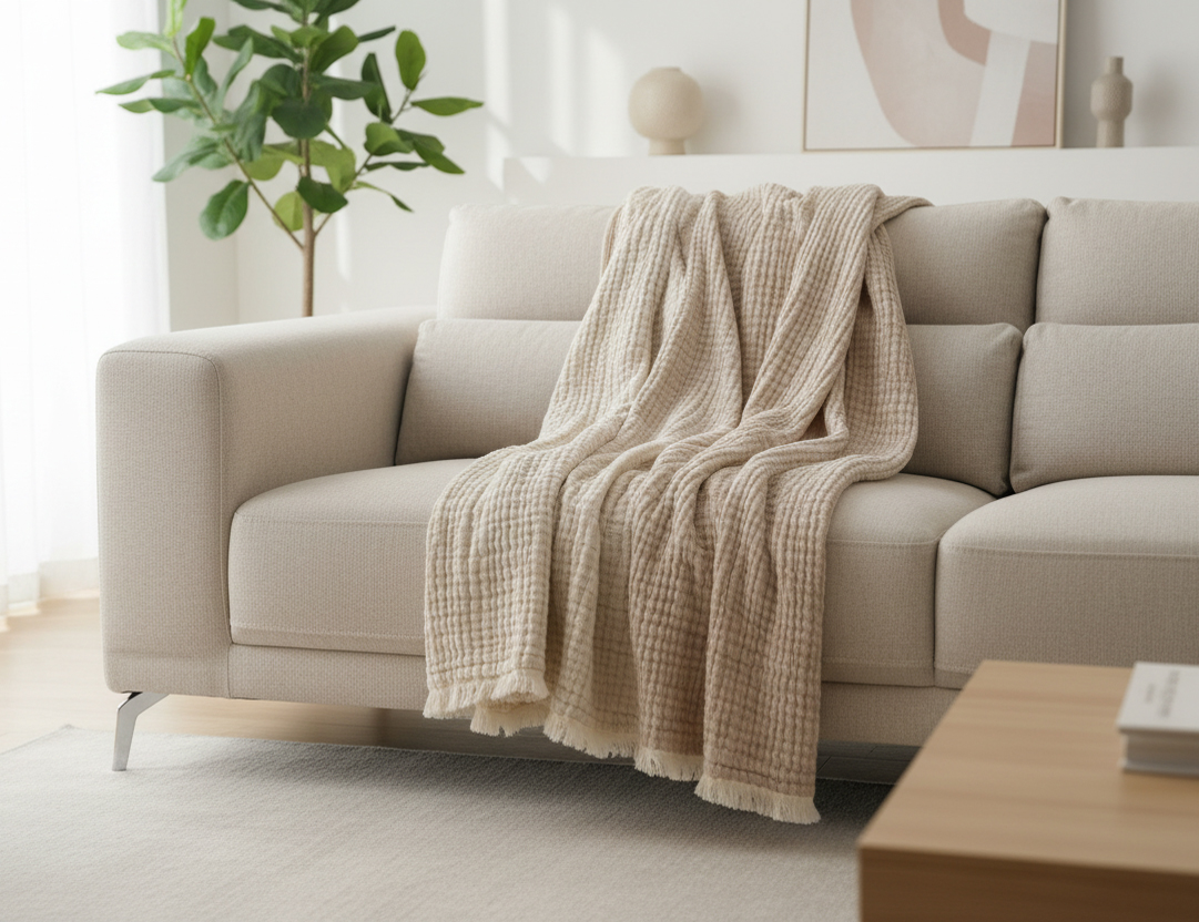 Plaid NOEMI in exklusiver Musselin Qualität in double-face erhältlich. Kann auch als Sommerdecke oder Bettüberwurf verwendet werden.